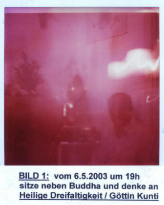 Eva kauft sich einen Buddha ruft mich an und sagt ich soll mir den Buddha anschauen. Er besteht aus einem Stück Holz, und ist vergoldet. Nachdem ich den Buddha besichtigt habe, setze ich mich neben ihn denke an die Heilige Dreifaltigkeit und; an die hinduistische Göttin Kunti, mit dem wir beide energetisch verbunden sind. Sofort entsteht über meinem Kopf ein Schlapphut aus purem Licht, in dem auf der Höhe meines dritten Auges auch noch Schriftsymbole zu sehen sind. Buddha selbst glänzt stellenweise golden, obwohl kaum Licht im Raum war und kein Blitzlicht verwendet wurde. Die Energie ist über den Buddha ganz bläulich, was er mir feinstoff- lich auf der Herzebene überträgt - das ist meine Interpretation, die Schriftsymbole sind mir unbekannt.