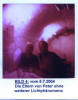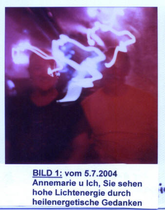 Peter macht das zweite Bild mit mir und nun passiert folgendes: Auf diesem Bild sieht man deutlich eine Herzform auf meinem dritten Auge, das mit violettem Licht gefüllt leuchtet. Über meinem Kopf sieht es so aus, als ob eine linke Hand mein Kronenchakra berührt - beschützt. Die Bedeutung des Herzes zwischen meinen Augen in violett, ist nach meiner Meinung eine Transformation über das Herzchakra, die Vorgeschichte wird von mir erklärt