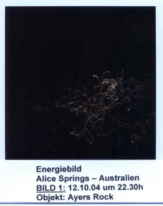 Ich befinde mich in Australien in ( Alice Springs ) im Zentrum des Kontinents, bei den Aboriginals. In der Nacht haben Eva und ich Fotos gemacht, sie ohne - ich mit Erfolg. Am 12.10. 2004 um 22.30h habe ich in Richtung Ayers Rock bei absoluter Dunkelheit fotografiert, ich dachte bewusst an die Energie des Berges und seiner Ureinwohner. Es baut sich langsam eine leichte wirbelartige Energie auf, sonst ist nichts zu erkennen